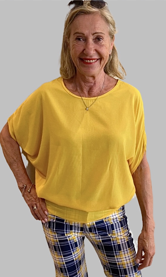 Top fluide de forme arrondie avec manches courtes inversées chauve-souris. (C070)