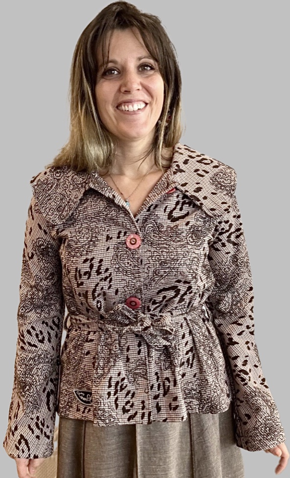 Veste ceinturée avec manches longues légèrement évasées et boutons roses. (J004)