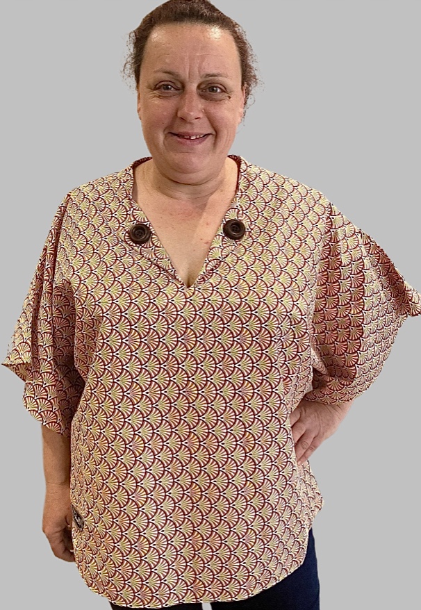 Tunique col V à boutons avec manches trois-quarts trompettes. (C049)